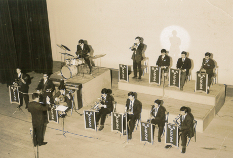 ニューソニックジャズオーケストラの前身は、1968年頃に古賀ギター教室のメンバーが中心となって結成した歌謡バンドで、当時は地下倉庫で練習をしていました。その後、社交ダンスの生バンドとして「SKアンサンブル」、「サウンド・オブ・キングス」に改名し、ビッグバンドとして本格的に始動しました。